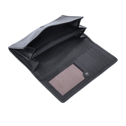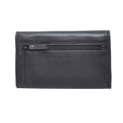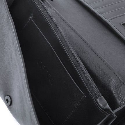 In de portemonnee is opbergruimte voor 9 pasjes. Aan de binnenkant van de klep 7 pasjes en 2 pasjes in de papiergeldvakken in de portemonnee. Er is een ritsvak voor muntgeld en twee papiergeldvakken. Achter het achterste papiergeldvak zit een smal insteekvak. Op de achterzijde van de portemonnee is een ritsvak waar eveneens muntgeld in opgeborgen kan worden. De portemonnee wordt afgesloten met een stevige drukknop.