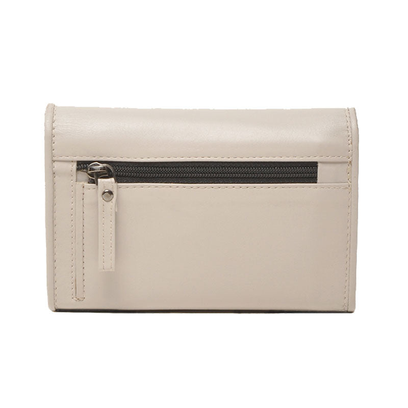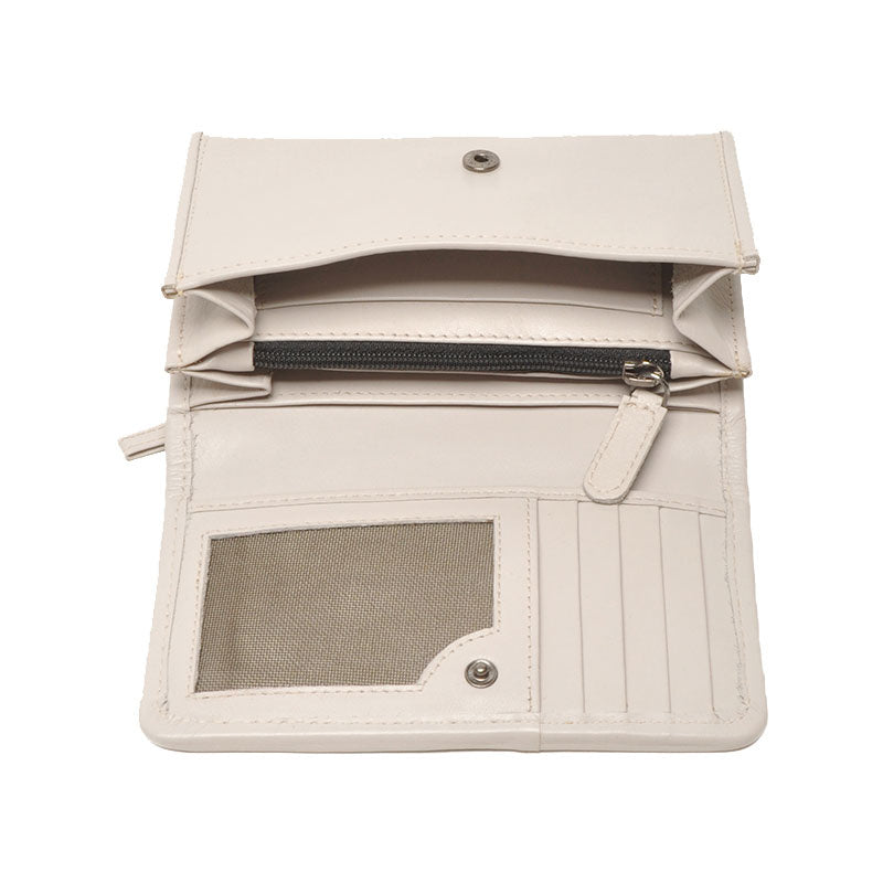 Deze portemonnee is volledig in leer uitgevoerd. In de portemonnee is opbergruimte voor 7 pasjes. In de binnenzijde bevinden zich een ritsvak en een papiergeldvak. Daarnaast zijn er nog 2 smalle insteekvakken, 1 achter het pasjesvak en 1 achter het achterste papiergeldvak. Op de achterzijde van de portemonnee is een ritsvak waar muntgeld in opgeborgen kan worden. De portemonnee wordt afgesloten met een stevige drukknop.