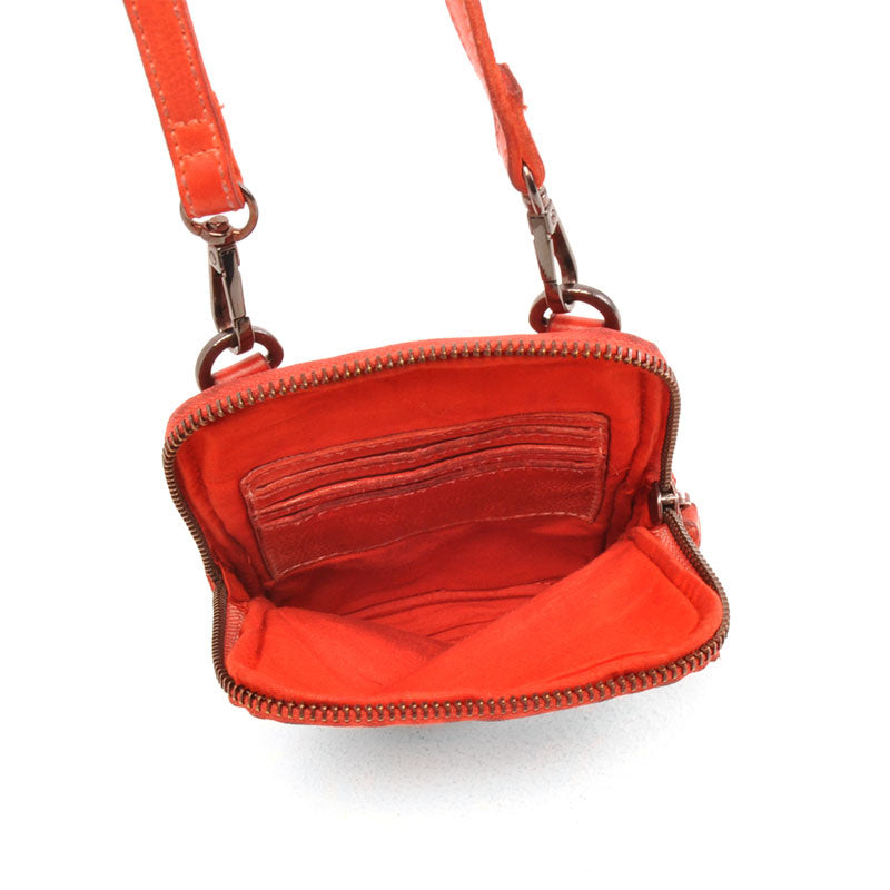 De binnenzijde van het tasje is gevoerd met katoen. In de binnenzijde van het tasje kun je naast je smartphone ook 3 pasjes opbergen. En natuurlijk andere dingen, een lippenstift bijvoorbeeld of je sleutels. De achterzijde van de tas heeft geen peroratie in het leer. Op de achterzijde bevindt zich een klein ritsvakje. Het schouderiempje is van leer en is verstelbaar.