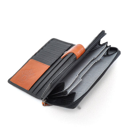 Mooie leren dames clutch uit de Chamonix collectie van het merk Berba in een mooie zwarte kleur. Berba is een merk wat zich kenmerkt door gebruik van soepele leer soorten en het combineren van kleuren en materialen. Voor deze damesportemonnee is gebruik gemaakt van generfd runderleer. Het leer heeft een mooie structuur wat mooi combineert bij het gladde leer in cognac kleur. De uiting van het merk Berba is op een verfijnde manier toegepast, op diverse plekken, op deze portemonnee. Op de voorzijde van de portemonnee is het logo van het merk zichtbaar. Op de lipjes van de ritsen is de naam Berba op subtiele wijze toegepast.