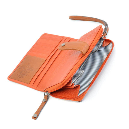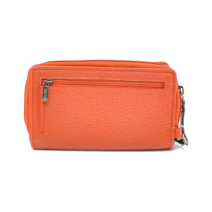 Mooie leren dames clutch uit de Chamonix collectie van het merk Berba in een mooie warme kleur. Berba is een merk wat zich kenmerkt door gebruik van soepele leer soorten en het combineren van kleuren en materialen. Voor deze damesportemonnee is gebruik gemaakt van generfd runderleer. Het leer heeft een mooie structuur wat mooi combineert bij het gladde leer in cognac kleur. De uiting van het merk Berba is op een verfijnde manier toegepast, op diverse plekken, op deze portemonnee. Op de voorzijde van de portemonnee is het logo van het merk zichtbaar. Op de lipjes van de ritsen is de naam Berba op subtiele wijze toegepast.