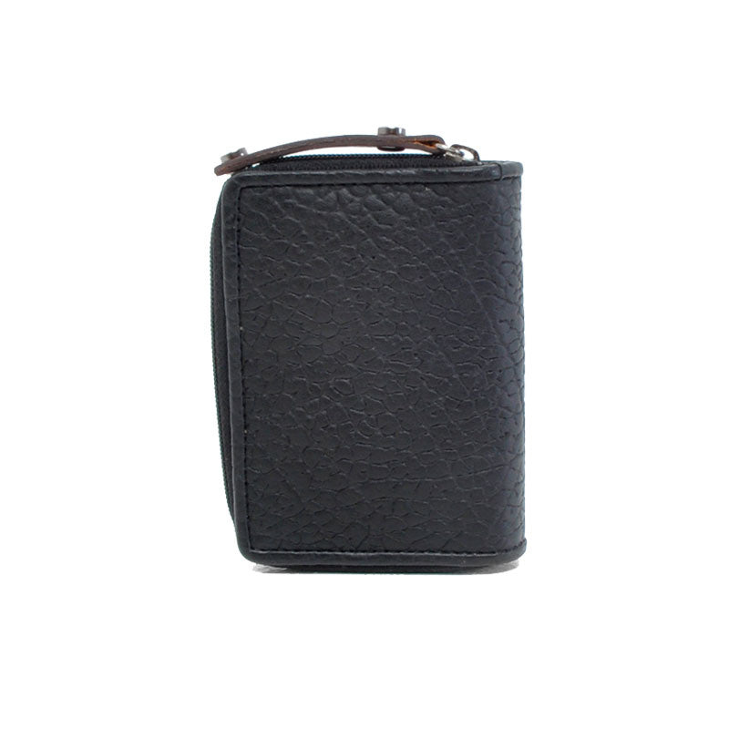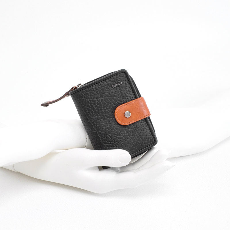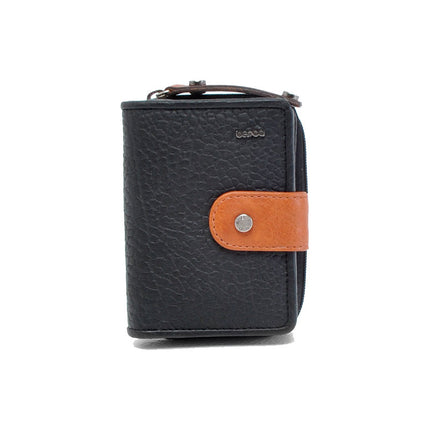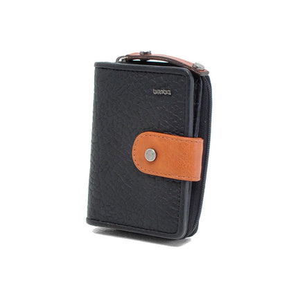 Mooie leren dames ritsportemonnee uit de Chamonix collectie van het merk Berba. Een klein handzaam en compact model in een mooie zwarte kleur. Het merk kenmerkt zich door gebruik van soepele leer soorten en het combineren van kleuren en materialen. Deze dames ritsportemonnee is gemaakt van generfd runderleer. Generfd leer heeft een mooie structuur wat mooi combineert bij het gladde leer in cognac kleur. De uiting van het merk Berba is op een verfijnde manier toegepast, op diverse plekken, op deze portemonnee. Op de voorzijde van de portemonnee is het logo van het merk zichtbaar. Op het lipje van de rits en de lip op de voorzijde is de naam Berba op subtiele wijze toegepast.