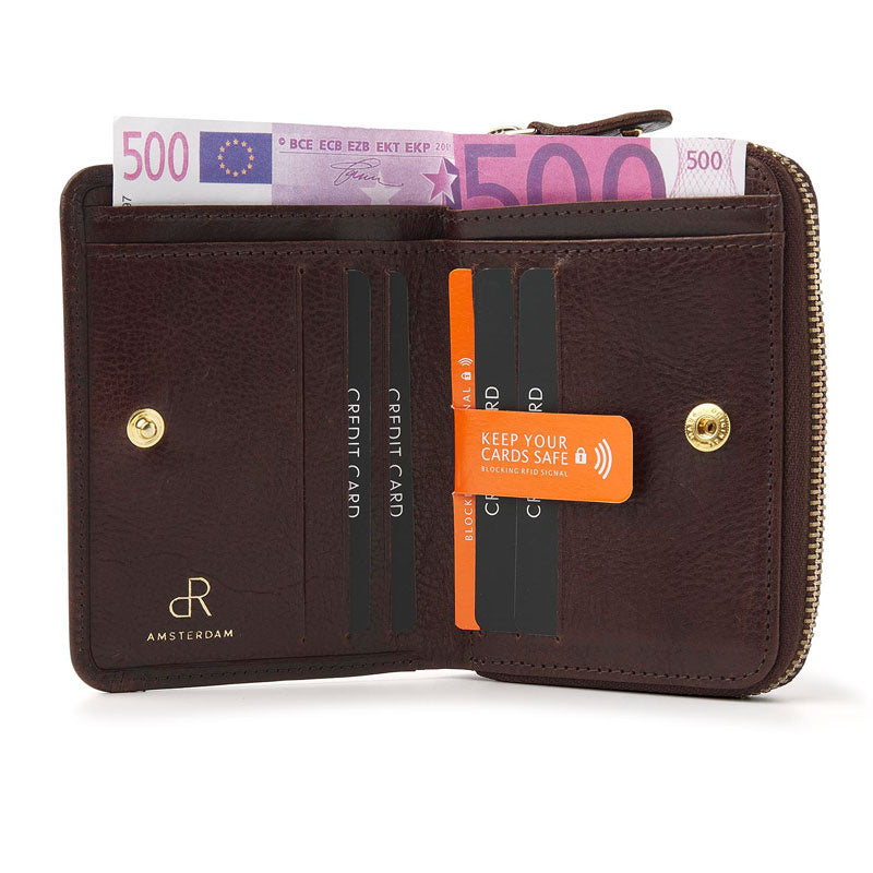Stijlvol en tijdloos dat beschrijft deze dames ritsportemonnee uit de Milan collectie van het merk dR Amsterdam. Een dames portemonnee super stijlvol van ontwerp en afwerking. Een portemonnee type vrouwelijk chique. Deze portemonnee is afkomstig uit de Milan collectie van het merk dR. Een collectie die zich kenmerkt door het leer met karakter en het goudkleurige beslag. Een portemonnee met finesse tot in de kleinste details.