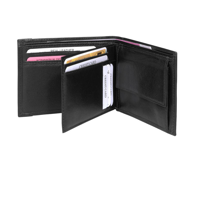 Links in de portemonnee is er opbergruimte voor 11 pasjes. Een pasjesvak is een venstervak. Om een pasje in op te bergen wat goed zichtbaar moet zijn of om bijvoorbeeld een foto in op te bergen. De portemonnee heeft 2 smalle insteekvakken. Een hiervan zit op de achterzijde van de portemonnee. Het muntvak bevindt zich rechts in de portemonnee en wordt met een drukker afgesloten. Het papiergeldvak bestaat uit 2 vakken.