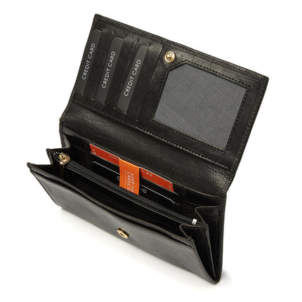 In deze portemonnee zit een papiergeldvak wat uit 2 vakken bestaat. Er is een vak met een rits, 4 smalle opbergvakken en een muntgeldvak achterop de portemonnee die wordt afgesloten met een rits.