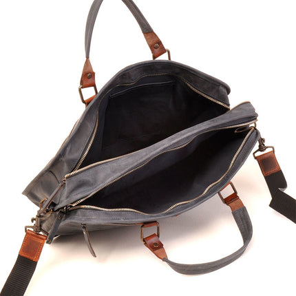 Op de voor- en achterkant van de tas zit een ritsvak. Ook is er een smal insteekvak achter het leren lipje. Dit lipje zit met een drukker vast. De binnenzijde bestaat uit 2 hoofdvakken die elk met een rits worden afgesloten. In een vak berg je je laptop op. Het andere vak heeft tegen de buitenkant een smal ritsvak, een telefoonvak en pennenlussen. De schouderband is verstelbaar, 3,8 cm breed en heeft een onderzijde van stof waardoor deze niet zo makkelijk van je schouder afzakt. Uiteraard is de tas ook gewoon te dragen aan de handvaten.