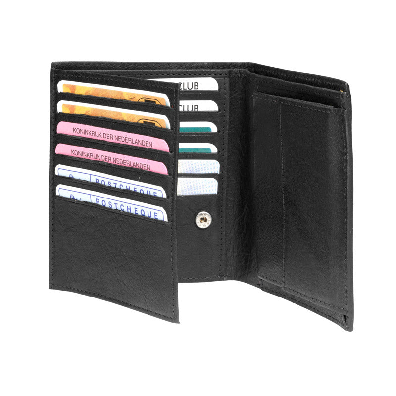 Links in de portefeuille is opbergruimte voor 13 pasjes. Een van de pasjesvakken is een venstervak. Er kunnen ook foto's in opgeborgen worden. Er zijn 2 smalle insteekvakken. Het gedeelte met de pasjes wordt met een drukker bij een gehouden. Het muntvak bevindt zich rechts in de portemonnee. Het papiergeldvak bestaat uit 2 vakken.