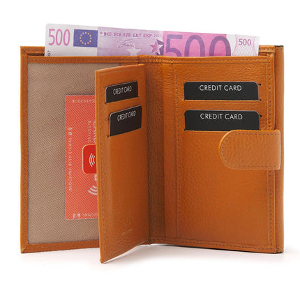 Deze portemonnee in mooie warm rode kleur heeft aan de ene zijde het muntgeld vak en aan de andere zijde het papiergeldvak en de opbergvakken voor pasjes. Het muntvak bestaat uit 2 vakken en sluit met een drukker. Het papiergeldvak is royaal en bestaat uit een vak. Er kunnen in de portemonnee 11 pasjes opgeborgen worden. Er zijn 5 smalle insteekvakken. Deze bevinden zich achter de pasjesvakken. Een van de insteekvakken is een venstervak. Leuk om foto's in op te bergen.