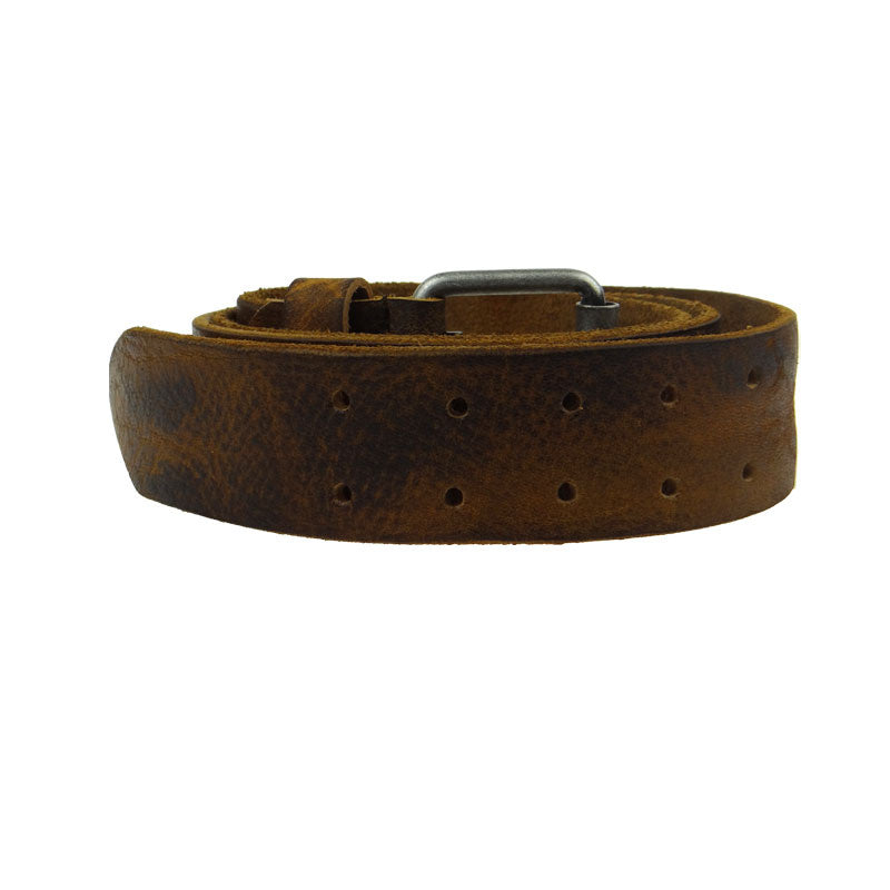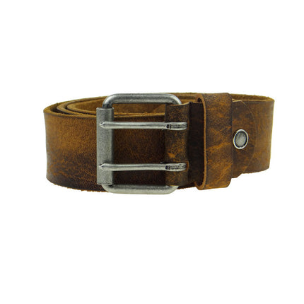 Deze riem is uitgevoerd in een geelbruine kleur leer. Leer van 3,8 mm dik. De foto geeft een goede indicatie van het uiterlijk van de riem. De bewerking van het leer maakt echter dat elke riem uniek van uiterlijk is. Het leer heeft een gevlamd uiterlijk door de verschillende kleurnuances. Lichte en donkerdere tinten. De riem krijgt hierdoor karakter en een stoere, ruige uitstraling.
