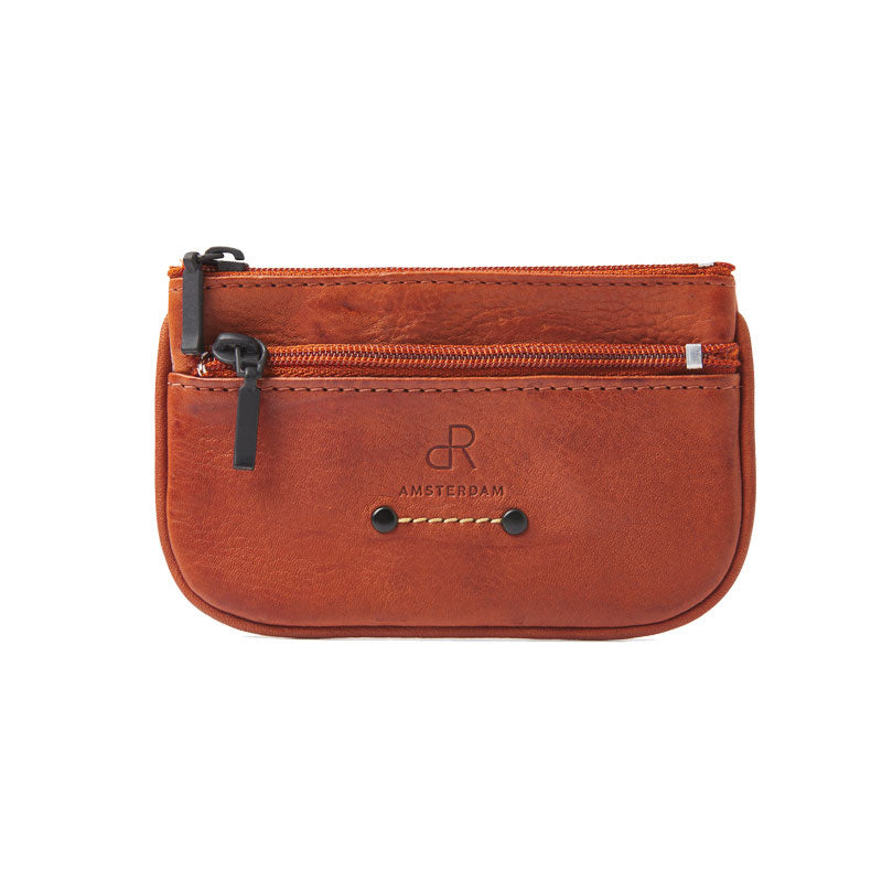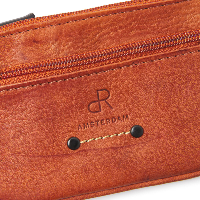 Bijzonder aan deze sleuteletui zijn de kleine details zoals het stiksel en zwarte studs op de voorzijde van de sleuteletui. De zwarte lipjes van de ritsen en de zwarte sleutelringen. Maar ook het logo van dR Amsterdam wat op subtiele wijze in het leer is gestanst op de voorzijde van de etui.